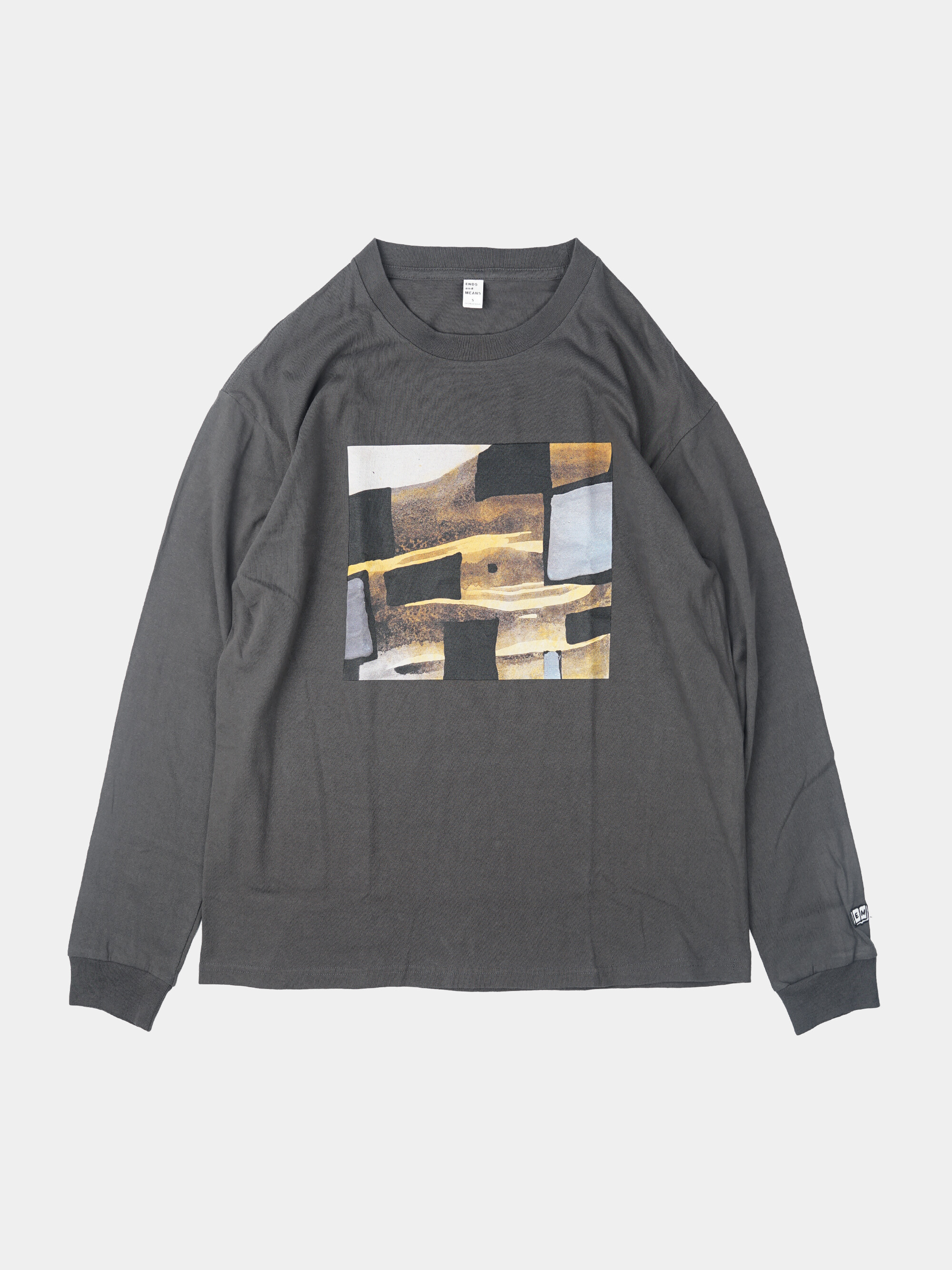LIFEMODERNSERVICE 의 로고와 레나 후지모토의 아트워크가 프린트 되어 있는 롱 슬리브 티셔츠.